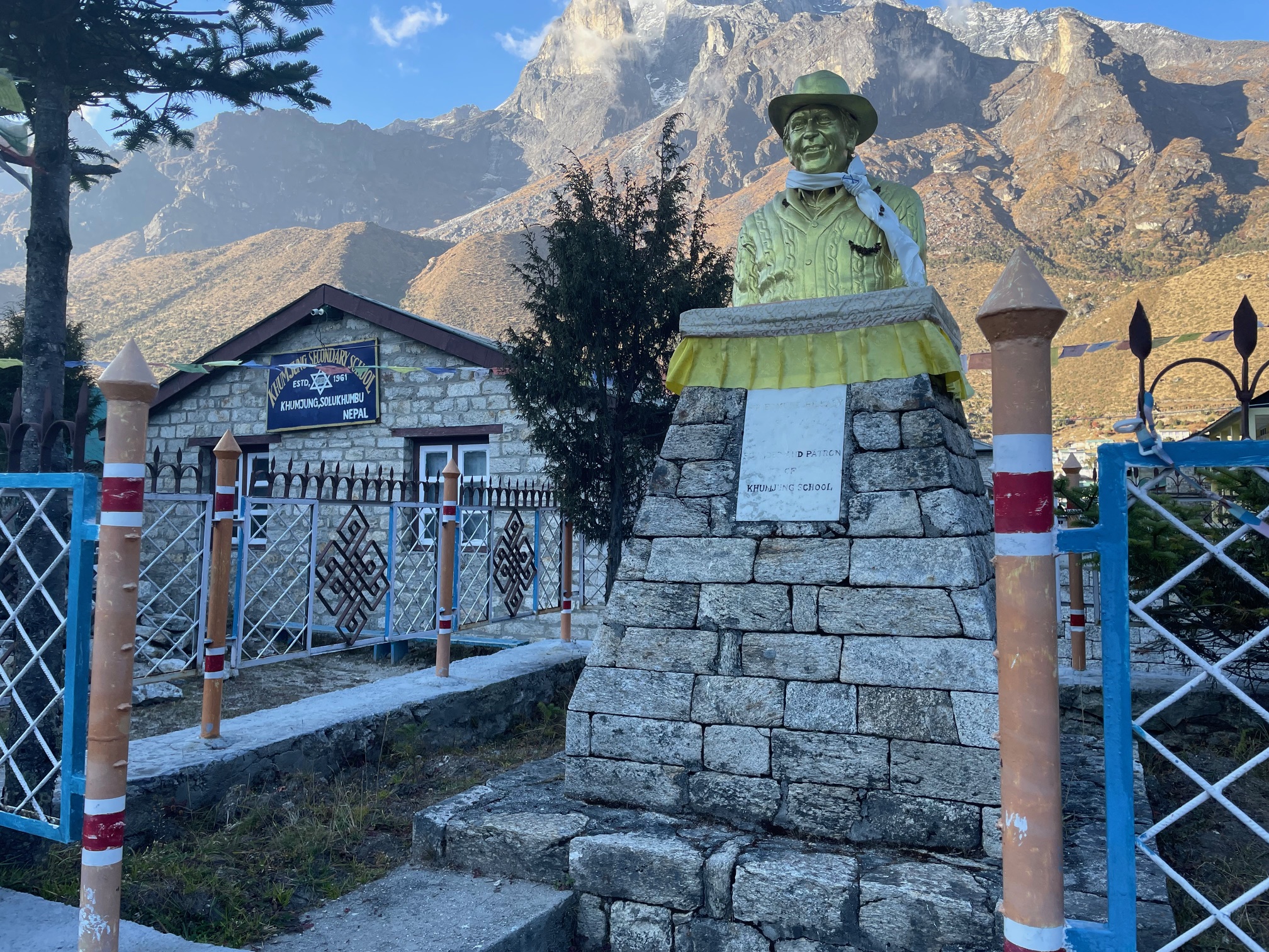 Which brings me to the title of this piece. Sir Edmund Hillary capitalized on his world fame by establishing a foundation to “Improve the quality of life of the Sherpa people of Nepal in the areas of Education, Healthcare, and the Environment.” I saw its work first-hand; the photo shows a school he established, along with a commemorative bust of thanks. This is the same school my Sherpa guide attended after a walk of an hour to arrive (with no excuses for being late).