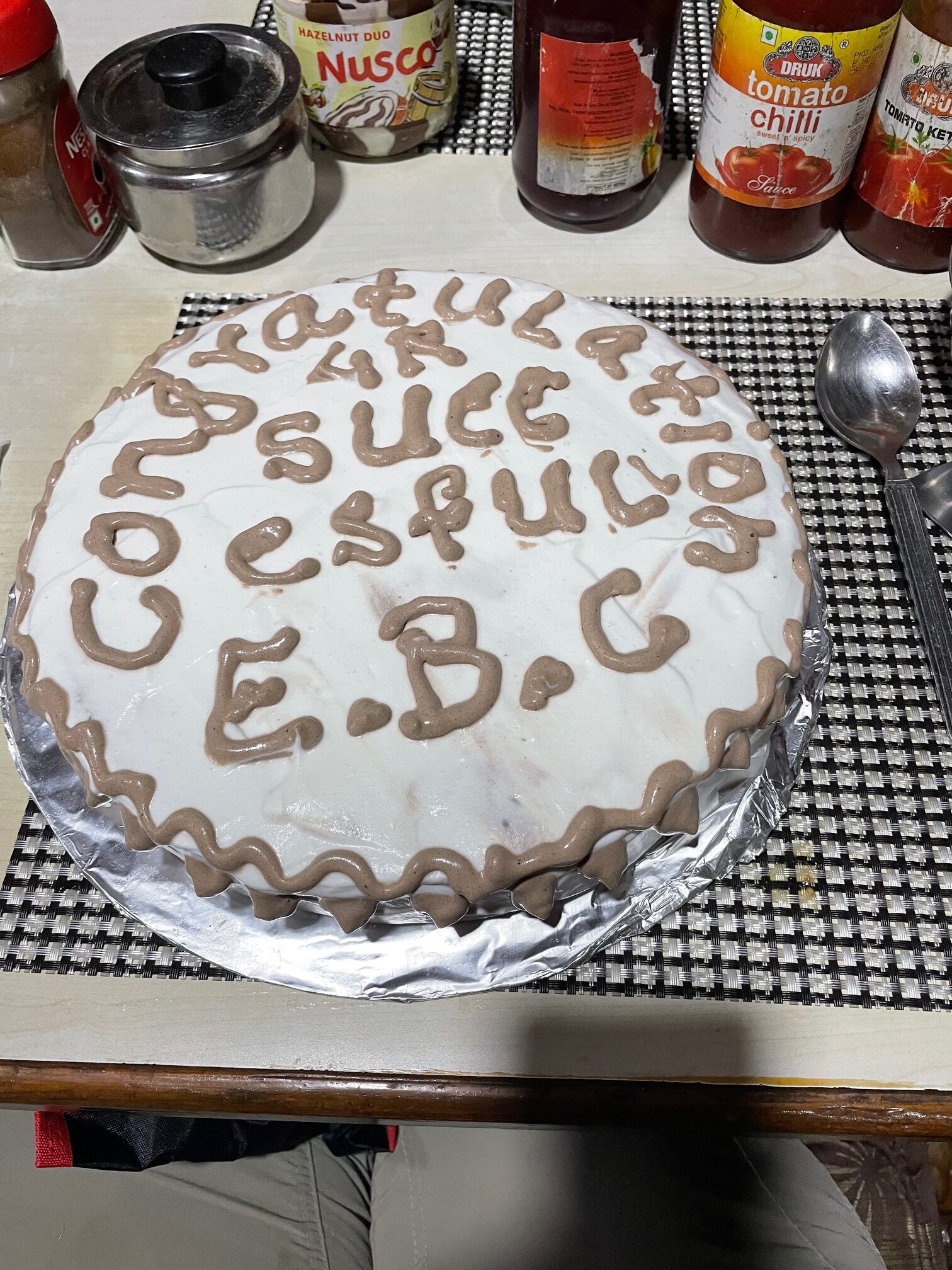 In my case, I owe my Sherpa guides and porters more than most trekkers. I was able to make the trek to Base Camp, and survive reasonably intact, only because of their accommodating the special needs stemming from my “unyouthful” age. This went so far as to present me with a celebratory cake, “Congratulations 4R Successful EBC [Everest Base Camp].” Everyone loves cake, right?