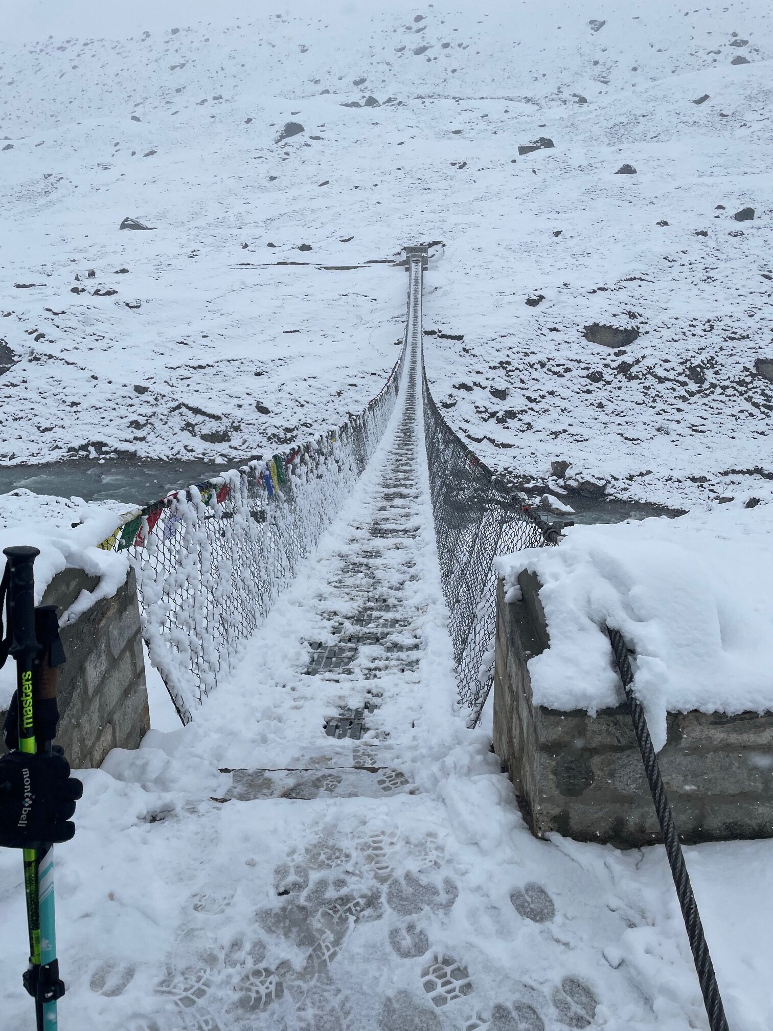 And the old saw about getting to the goal is only the halfway point is exactly true; now we had to retrace our steps. Up to that point the weather had been perfect, but on Day 14 we woke up to about two inches of snow. A bit further down, it was rain on Days 15 through 17. We were scheduled to helicopter back to Kathmandu on Day 18 for departure on Day 19, but the extended rain had backed everything up to where the transportation commitments were overtaxed.